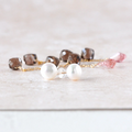 ・天然石:スモーキークォーツキューブカット6mm前後/ストロベリークォーツ8mm/ボタン淡水パール7mm