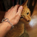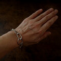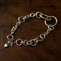 色々な種類のシルバーの輪を組み合わせて繋げた、シンプルでありながら楽しいブレスレットです。エンド部分には、♥と☆のチャームが付いていて、さりげなく遊び心もある、クールでかわいい作品です。