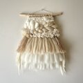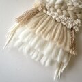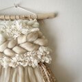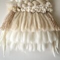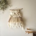 やわらかなお色のミルクティーカラーの羊毛をメインに、極細ウールやコットン、ファンシーヤーン等を組み合わせ、気持ちも身体も温かくしてくれるような、甘いミルクティーをイメージしたふわふわもこもこの愛らしいタペストリーに仕上げました。