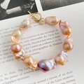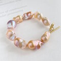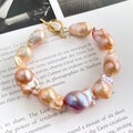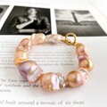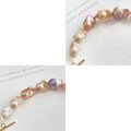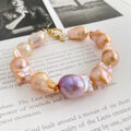 中央にバイオレットパープルの色味が強い、少し大きめの中粒サイズのパールを置き、ピーチオレンジからペールピーチカラーでグラデーションぽく配置したオイスターパールのブレスレット。