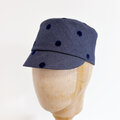デニムカラーのコットン/ウール素材に紺色の別珍ドットレースを重ねて、女性らしく仕上げたキャップです。ブリム部分を浅くすることでスポーティーになりすぎず、日常的に被りやすい帽子だと思います。