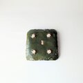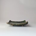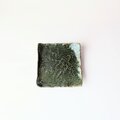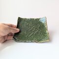 表面には岩肌を思わせる自然な凹凸があり、そこに溜まった釉薬の濃淡が美しい一枚ごとに異なる風合いをもつお皿です。落ち着いた深緑色が、和食はもちろん、洋食やスイーツとも相性抜群。