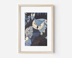 三日月の夜の森の三羽のフクロウを スクラッチタッチで描いた、モノクロ水彩画のポストカード「3枚セット」です