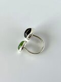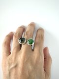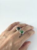 不透明と透明感のある石、薄茶色とグリーンの対照的な組み合わせが楽しいダブルストーンのリングです。