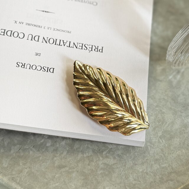 ゴールドトーンのリーフブローチ。