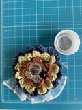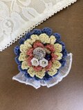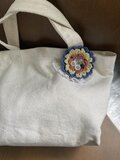 コットン糸で編んだ立体的なお花モチーフ、ビーズのブローチです。バッグや服、帽子などのワンポイントに。