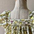 ☆ 小さめなレモンの柄で、ベースは薄いクリームです。前後ヨークには、生地の色柄に合わせて鮮やかなお花と葉の刺繍を入れました。