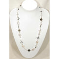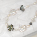 照りの美しい様々な貝パーツ(マザーオブパール、白蝶貝、黒蝶貝、鮑貝、アバロンシェル)と本真珠(淡水パール)、光沢感の綺麗なオニキスのロングネックレスです。チェッカーボードカットの黒蝶貝は2枚を貼り合わせており、両面が綺麗に輝きます。四角いバロックと丸い淡水パールの淡いピンクも見えるホワイトの色合いはナチュラルカラーです。
