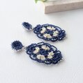 ビーズを編み込んだ丸いモチーフと透け感が美しいオーバル型のかぎ針編みモチーフを組み合わせた、クラシカルな雰囲気のピアス、イヤリングです。