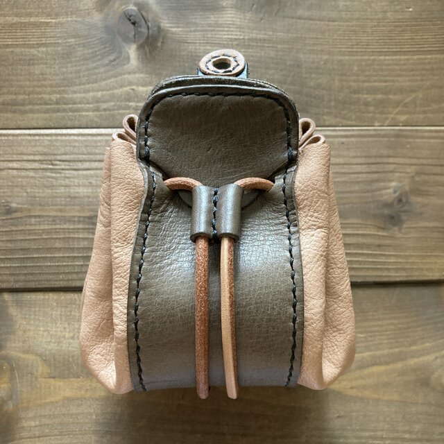 シボ入りのピンクベージュの革とグレーのロウ引き革の組み合わせを黒糸で仕上げておりナチュラルカラーの革紐で絞るタイプのポーチのカスタムタイプです。