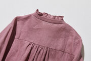 フリルデティールの立体裁断シャツ 長袖 リネンシャツブラウス 明るい渋い赤 250809-1