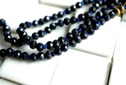 深い青が黒く見える美しいサファイアをシルク糸で結びながらつなげていったネックレス。石は直径4mm、厚みが3mmのボタン型の石なので、糸に2粒通してはひと結び、その次は3粒通してひと結び…といった作業を繰り返しています。