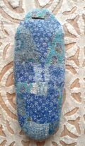 ブルーやグリーンの花柄やペイズリー柄、ストライプ柄のブロックプリントの生地をパッチワークして表の面の模様を作っています。