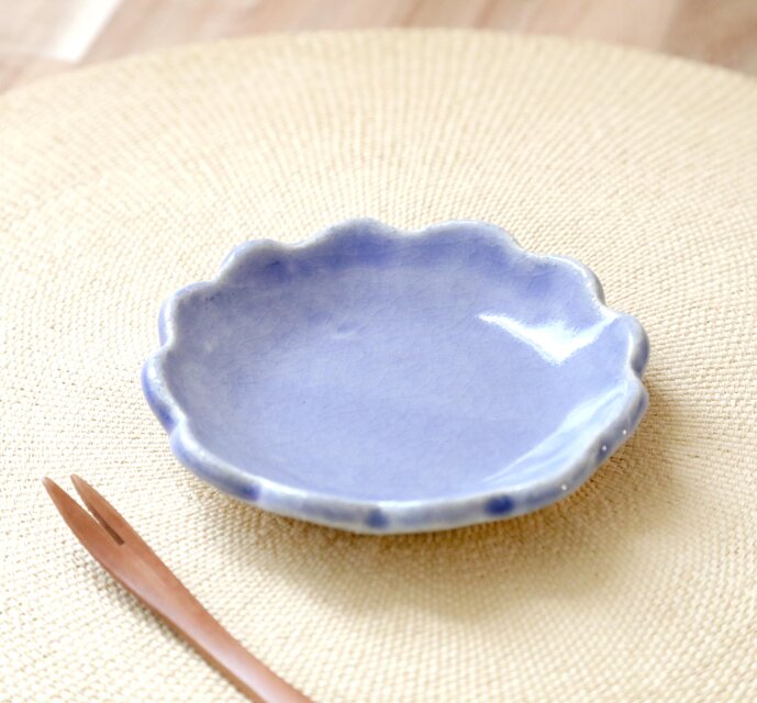 十二枚という多めの花弁の小さなお皿はフリルのような可愛らしさを持ちつつも、制作時の手の跡も感じられ素朴な雰囲気を持っています。