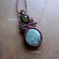 透明度はありませんが、深い緑色が神秘的な珍しいブラジル産エメラルドと上部には新緑を思わせる爽やかなグリーンカラーが美しいアメリカ産ペリドットを合わせたマクラメ編みペンダントネックレスです。