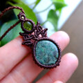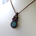 宝石のエメラルドとは全く違った雰囲気ですが、自然の色合いや風合いが印象的なエメラルドをシックな色合いのコードで編み込んで存在感溢れる1点ものマクラメアクセサリーに仕上げました。