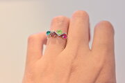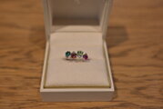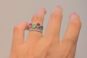 画像は合成エメラルド、ガーネット、ペリドット、合成ルビー、地金:プラチナ