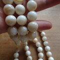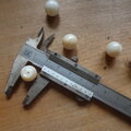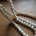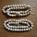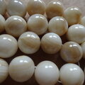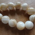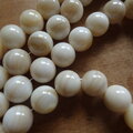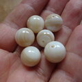 2枚貝の蝶番のある厚い部分から削り出した丸玉です、色は明るいベージュ~オフホワイトで1個は2.5gくらいあり100個はずっしりとした重みがあります。まるで大理石のような質感です。ところどころに貝特有の貝箔が見られます。