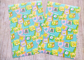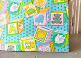 薄手ですが、ハリのあるしっかりとした紙質。現地でも人気の希少な絵柄。Aはアップル。Dはドッグ。Rはラビット。キュートなアルファベットのブロックをちりばめた、ポップカラーの包装紙。