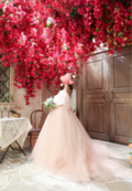 カラードレス 薄ピンク ベアトップ パフスリーブ チュールスカート 3D立体レース刺繍 花嫁 結婚式