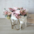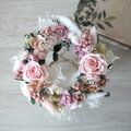 プリザーブドフラワーの優しいピンクのローズをメインにアンティークな雰囲気でまとめた上品なアイアン付きのアレンジメント。
