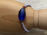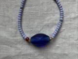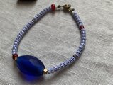 トップは紡錘型にゆるくカットが施されたきれいなセミクリアの瑠璃色ビーズ。合わせたのはヴェネチアのスジ玉のシードビーズランダムの大きさの違う赤いホワイトハートとエチオピアのメタルビーズを入れています。