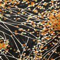 墨黒の地に、刷毛で走らせたような白枝が斜めに奔り、橙と若草の粒が南天の実のように弾けるモダン柄。ほの艶が粒の煌めきをやわらげ、柿橙の帯サッシュが色を拾って全体をキリッと束ねます。黒の組紐タッセルが揺れ、和モードの余韻を結ぶ一着。
