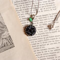 黒のガラスにオーロラの輝きが重なり、まるで「夜に咲く花」を胸元に添えたような印象です。ボタン表面には愛らしい花模様が彫刻され、光を受けるたびに表情を変えます。
