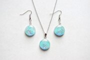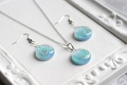 数種類のブルーが滲みあう様子が複雑なニュアンスを生んでいるピアス。散らしたシルバーのラメが上品さと華やかさを添えています。