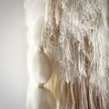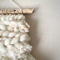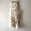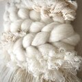 みるく色のふわふわクロスブレッドをたっぷり使用し、コットン、リネン、モヘア、ファンシーヤーン等たくさんの素材糸を組み合わせて織りあげた、印象的なタペストリーです。
