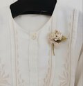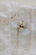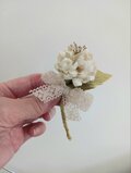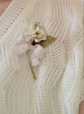 ベージュに染めたポンポンダリアに葉を添え、ベージュに染めたレースリボンを結び、アンティークでお洒落なコサージュに仕上げました。