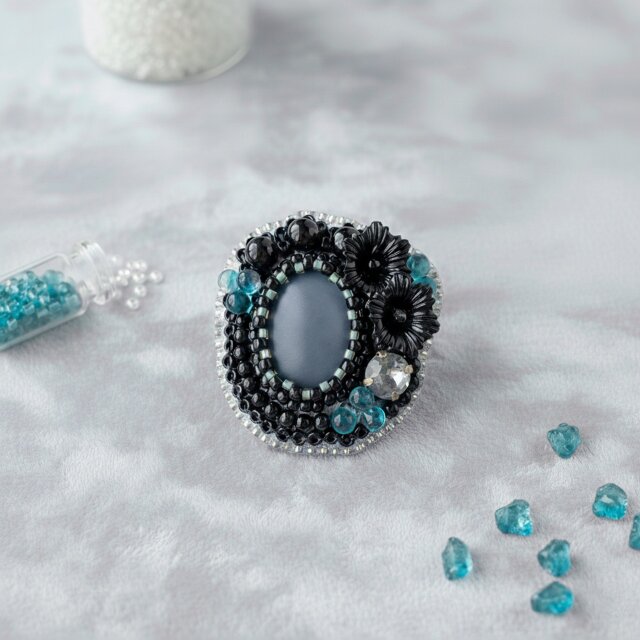ブルーとブラックのビーズ刺しゅうブローチ(K1232)
