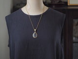 何の変哲もない、半透明のこのアゲートには実は秘密があります。裏側から光を当てると、虹が現れるのです。希少石である上、なかなか高価なのですが、大変人気が高く、悩んでいるうちにSOLD OUTというはめに。今回は特に模様の入り方が素敵だったので即断しました。デザインはごくシンプルにして、バチカン部分にだけ飾りを付けました。