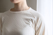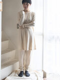 60番という細い糸で二重に編んである接結ニットで、甘く編んであるので、表と裏の生地が左右別の方向へ流れようとするのですが、 接結部分で留めてあることによって、自然に斜めのうねが生じ、優しい表情を加えます。