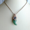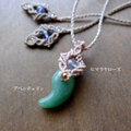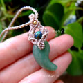 新緑のような深みのあるグリーンカラーが魅力の5月誕生石インド産アベンチュリン勾玉のマクラメ編みペンダントです。上部には濃い青色のアズライトと、反対側にガネーシュヒマール産のヒマラヤローズクォーツをあわせリバーシブル仕様のマクラメアクセサリーに仕上げました。