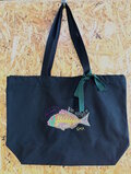 鮮やかな魚が泳ぐように描かれた、ユーモラスでどこかアートなトートバッグ。
