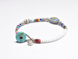 ターコイズブルーやブルーのシェブロンビーズ、シマシマ模様のカンネビーズ、レアカラーのホワイトハーツ、金赤色のホワイトハーツ、渋いピンク色のピンクマサイなどを繋いでいます。
