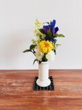 【 お仏花ブーケ 】ピンポンマム イエロー新作供花を購入しました。花束様にラッピングしてくださって一緒に注文の花器と同梱で丁寧に送ってくださいました。本物のような造花、アーティフィシャルフラワーというのですね。AIならぬAFでしょうか。プリザーブドよりも丈夫そうな、優しくそっと拭くこともできそうです。花材組み合わせがとても自然で美しく見ていて和みます。