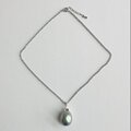 こちらはガラス素材の原玉に、オリジナルカラーのパール塗料にて何層にも渡り重ね塗りを施した日本製ガラスパールネックレスになります。パールカラーはきめ細かい質感と柔らかで優しい艶感で個性的な色合いのブルーグリーン色。グリーンがかったブルーをベースに外周にほのかなピンクの干渉色が浮き出るオリジナルカラーです。パールサイズは大粒の直径約19x24mm。素材もガラスの為やや重みもございます。チェーンの長さは全長約40cm。テールエンドにアジャスターを付けていますので約5cm程延長が可能です。