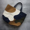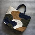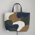 このバッグは、ミリタリーテイストのカモフラージュ柄をベースに、複数の綿素材を組み合わせたパッチワークデザインが魅力。さらに、刺し子ステッチをアクセントに加え、どこか温かみのあるクラフト感もプラスされています。