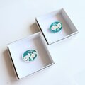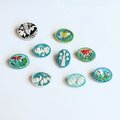 深いブルーグリーンのコットン地にことりと小さな草花を丁寧に手刺繍しました。素朴な北欧風のデザインです。周囲には極小のビーズをあしらっています。