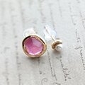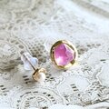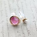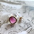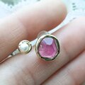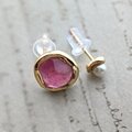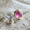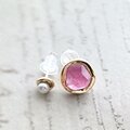 濃いピンクの薔薇が開花しいたように美しくきらめく、ルビー(またはルベライト)のフリーフォーム多面ミックスカットと、淡水パールを組み合わせたアシンメトリーピアス。