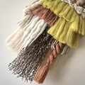黄金色やブラウン、ベージュ、ホワイト等を組み合せ、落ち着いたお色の中にも可愛さのあるタペストリーに仕上げました。