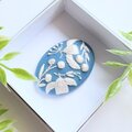 落ち着いた水色のコットン地に小さなことりと草花を丁寧に刺繍しました。