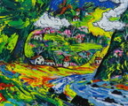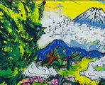「富士と山村のさえずり」(NO.2521) 6号F ケント紙(0.5ミリ厚)にアクリル絵の具 送料無料 安本太ん