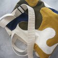 色とりどりの綿素材を使ったカラフルなパッチワークと手縫いのステッチは目を引くデザインながらも、落ち着いたカラーリングでコーディネートに自然になじみます。