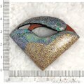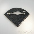 朱漆と純金箔で作られた変わり塗りと瑠璃色の螺鈿細工を施した上に、プラチナ箔の唐草模様を重ねた重厚な作りのブローチに仕上げました。