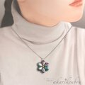 花型のシルバーの素地に、黒蝶パールの母貝である黒蝶貝で螺鈿を施し、さらに金箔とプラチナ箔で唐草紋様を箔押しした鈍色ピーコックグリーンの螺鈿ペンダント。見る角度によって変化する色味が華やかな一品。