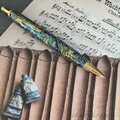 鮑貝を使用した螺鈿細工に、孔雀羽根紋様を純金箔とプラチナ箔で全体に箔押しした金沢漆器のボールペン。