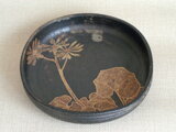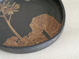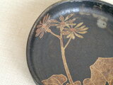 この作品は、信楽の土を使いろくろで作った鉢につわぶきを丁寧に手描きし、少しづつ加彩し焼成を重ねて仕上げています。金の縁取りがつわぶきに華やかさを添えています。